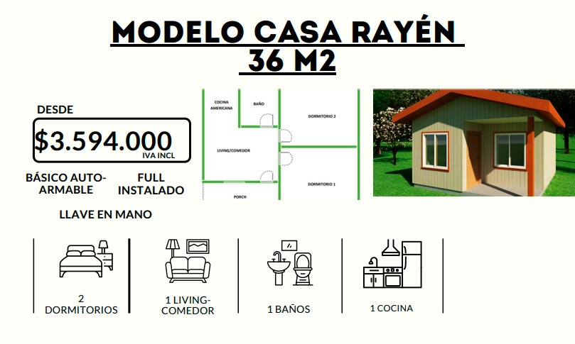 Incluye todos los paneles exteriores e interiores de la casa en tabiquería de 2×3, revestimiento exterior en Smart Panel, zinc pre-pintado o traslapo, elevación de cerchas de 1×5 sin revestimiento, caballetes, costaneras de 2×2, techo zinc 0.30 o 0.35 mm. Y papel fieltro antihumedad. (No incluye: Armado, piso (radier o apoyo), terminaciones, flete, ventanas, puertas, revestimiento interior, sistema eléctrico, ni gasfitería).